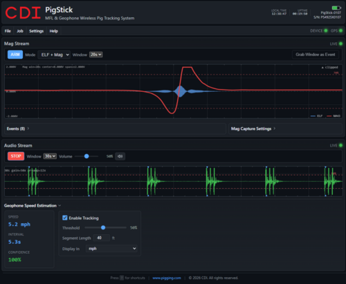 Listen to pig passages in real-time through your device speakers or headphones. See the audio waveform on screen while PigStick automatically estimates pig speed from weld strikes.